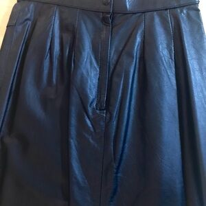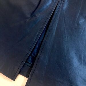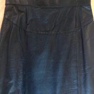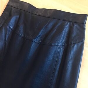 Sultry Vintage 80s Genuine Leather Midi Pencil Skirt. Vintage size 10 so please check measurements. Pleated on the back for great fit. Zip and snap button closure on back. Slit in the back is just under 11” long. Waist is 28.5. Center front length is 29.5”. Lined with nylon so it won’t stick to your skin. True black color. This skirt is timeless and can go with so much! Wear it casually with a tee and sneakers, dressed up with a blouse for work, or sexy night out with a lace cami. The possibilities are endless!