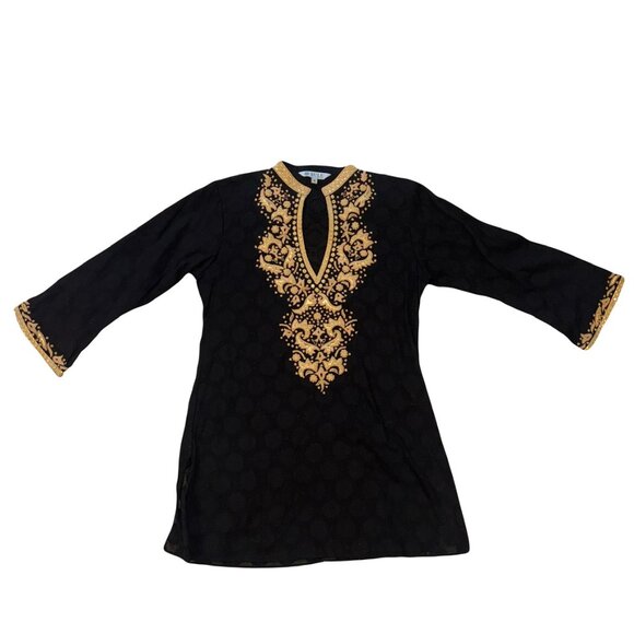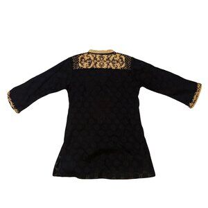 Elegant and richly detailed, this tunic from the Sulu Collection is crafted from 100% cotton with intricate gold embroidery and mirrored accents. The textured black fabric features subtle circular motifs throughout, while the neckline, cuffs, and back yoke are adorned with luxe embellishments. A striking statement piece that blends comfort and artistry—perfect for casual elegance or dressier occasions.