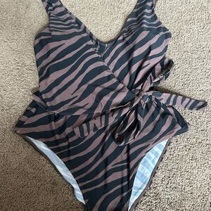 Stylish zebra print wrap swimsuit. Features a flattering tie waist design. V-neck pluging swimsuit swimwear.