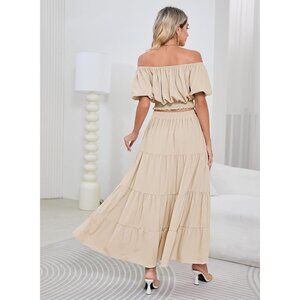Features: A lightweight, breathable polyester set with a flirty off-shoulder crop top featuring an elastic smocked bust and cuffs, plus a flowy high-waisted maxi skirt with pleats and a comfortable drawstring waist. The overall look is effortlessly boho, perfect for beach days, holidays, or casual outings.