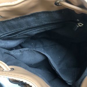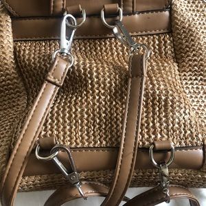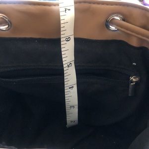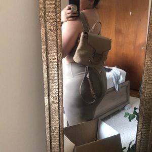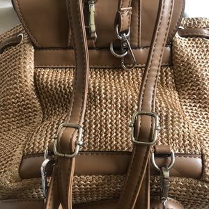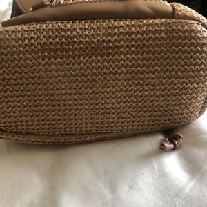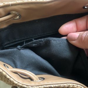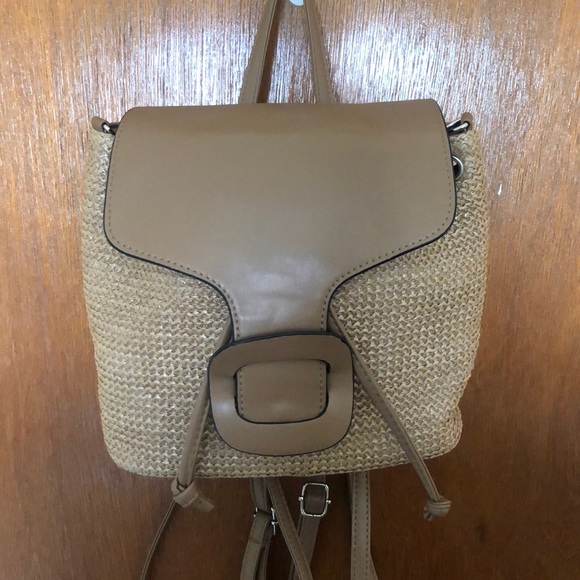 Cute little beach backpack with leather detailing. About 7”/8” tall, and 7” deep. One zipper pocket and one interior pocket inside. Adjustable shoulder straps so it can be worn as a backpack, saddle bag etc.
