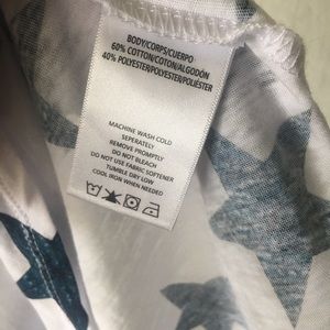 White with navy blue stars. Lightweight material. Key hole back. Rounded hemline. Wear for yoga or cover up afterwards. Or just as an everyday tank top.