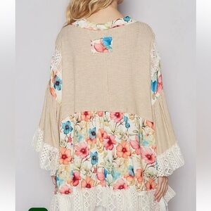 ( Price is firm) Elegant floral crochet detail open front cardigan. Features vibrant floral patterns and delicate lace details with 3/4 sleeves.