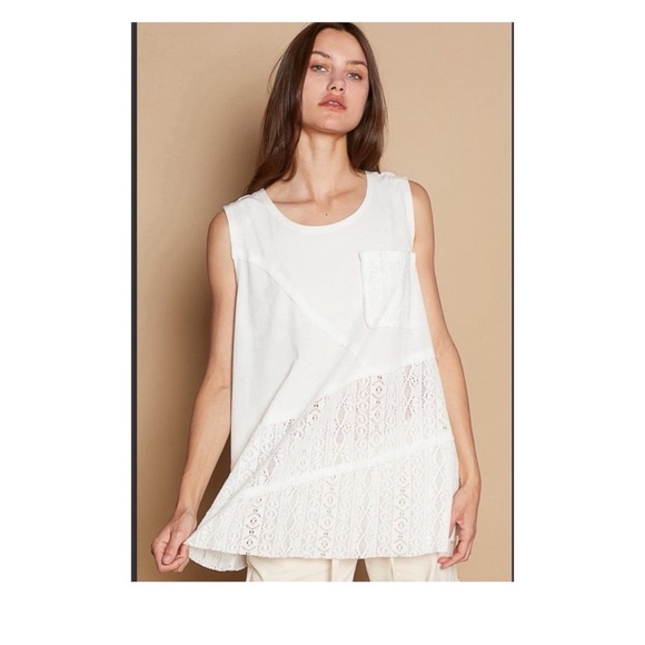 POL. White sleeveless top featuring delicate lace details. Perfect for a chic and stylish look.