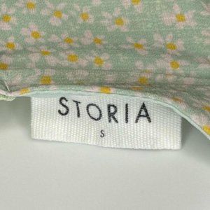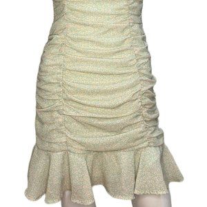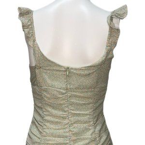 Floral ruched dress with square neck, ruffle trim and back zipper.