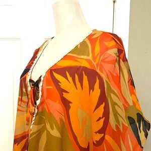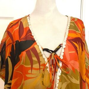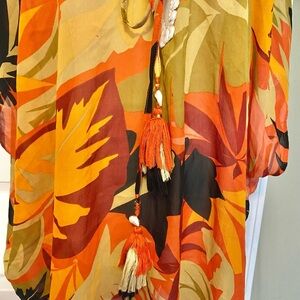 Vibrant kimono Sz L sheer swim suit cover up with a stunning orange and yellow pattern. Ties with tassel ends. Perfect for a sunny day. Beach, pool side, cruise, resort, vacation.
