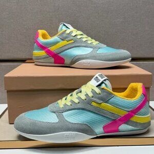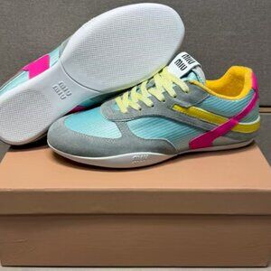 Step into style with MiuMiu retro sneakers! Light blue base, grey suede accents. Pink & yellow color - blocks pop, yellow inner lining adds a cozy touch. Lace - up design, comfy to wear. Perfect for daily looks, bringing trendy vibes. size: 6/36/ 7/37 8/38 9/39 10/40