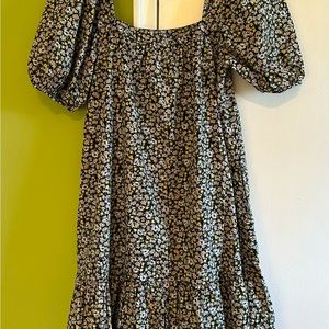 Women Printed Cotton Mini Dress, Size S, Short Sleeve, mini dress, 100% Cotton, lining, 36” long, 30”wide at the bust are, 2 pockets one on each side, square neck.