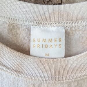 Great preowned condition tan and white tie dye crew neck sweatshirt from Summer Fridays. Embroidered Summer Fridays on chest. Made in Los Angeles California USA. Long sleeves. Reinforced ribbed knit on cuffs, collar, and hem. Light wash wear. Machine washable. Clean. No flaws.