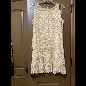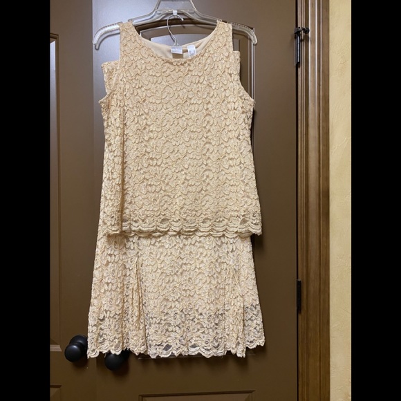 2 piece lace sleeveless top and a long skirt. Skirt is fitted at the top to the hips but is stretchy and flowy.