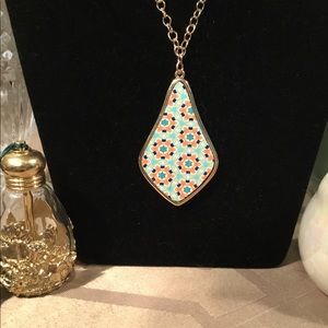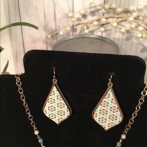 Cute Necklace Earring Set Reminds me of Summer Fun. Necklace is 36” long w/3” extender. Pendant 2 1/4”X1 1/2”..... Earrings 1 3/4”x1”...Beautiful Gold Trim and Chain.