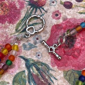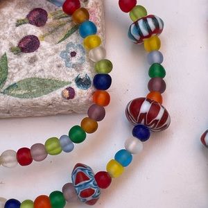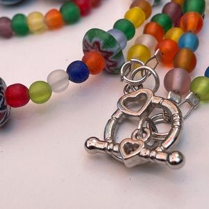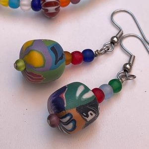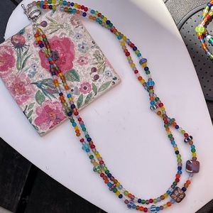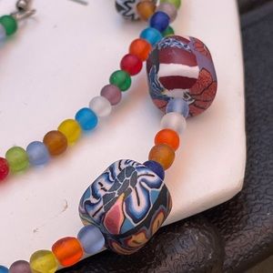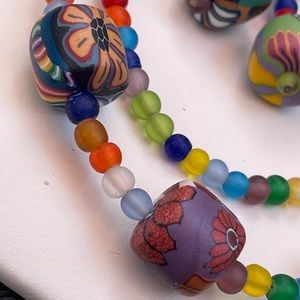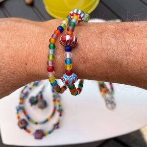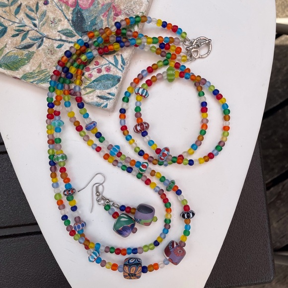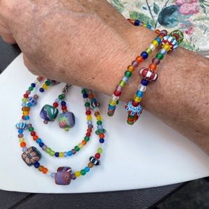 Handcrafted One of a Kind Multi-Color Glass Beads Adorned With Four Rubber Focal Beads for this Jewelry Trio of A Two Strand Necklace, Two Stretchy Bracelets, and Earrings. 🌺
