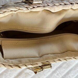 It has a zipper top, gold handles and is in excellent condition. Tie a scarf on it for more color.