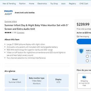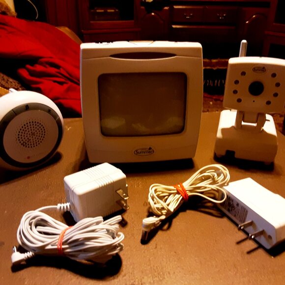 Summer Infant Day & Night B&W Video Monitor Set - Model 02602A – Used – Good Working Condition – Does not have the extra audio unit, comes with what’s picture., i.e., Monitor and Camera and power cords. Also has separate Project Nursery PNCLIP battery operated portable sound soother. (Has 6 different soothing sounds, volume control and 3 different playing time timers) Don’t know why screen looks bluish in picture of my dog but it only looks that way when in a picture, not when actually viewing monitor.