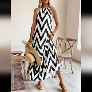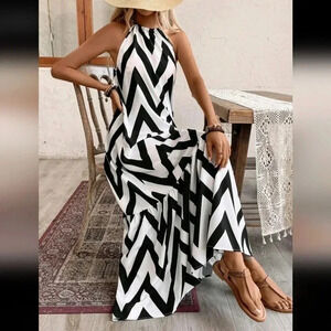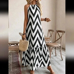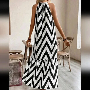 Summer Long Wave Stripe Halter Neck Dress With Ruffled Hem