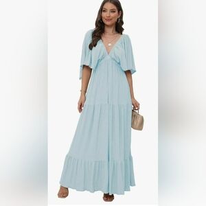 •Forever free and flowy, this effortless maxi dress is featured in a V-neck, tiered silhouette with flutter sleeves for added shape.