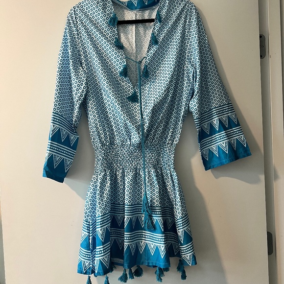 Summer Moroccan style dress with tassels. Teal blue and white. Size XL, fits like a L. Lightweight and perfect for summer or a beach coverup.