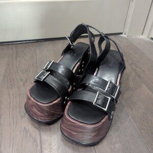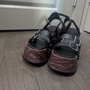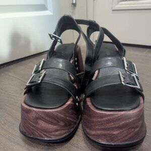 These wedges have a vegan leather construction, wood wrapped wedges, dome studs, and adjustable buckle closures. Never worn, but no original box.