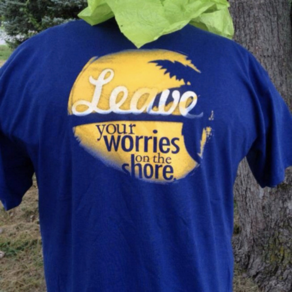 Sail away and leave your worries on the shore with this island-themed graphic tee. This yellow and white print on dark royal blue t-shirt looks great on both men and women. Women's plus sizes are available in another color in a separate listing. These shirts are screen printed with a custom-designed graphic that reads "Leave Your Worries On the Shore". High-quality Gildan 100% cotton t-shirt.