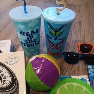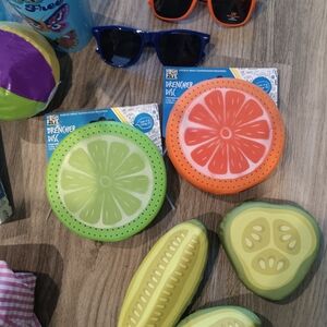6 assorted pool toys (orange, lime, pickles, beach ball)