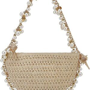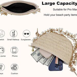Features: A charming crescent-shaped straw bag featuring a shoulder chain decorated with pearls, shells, conchs, and starfish — cute, fashionable, and perfect for summer. Lightweight yet durable, made from premium natural straw, ideal for bohemian look and beach days. Provides enough space for your essentials like phone, sunglasses, makeup, and small items. Soft bag body adds versatility and comfort.