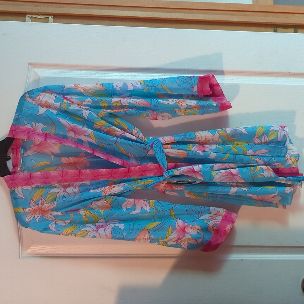 Wrapping robe with strings to tie on the inside, attached belt with a turquoise tassel for decoration. Wide bell sleeves with a split on each side of the bottom of the robe.
