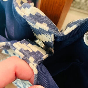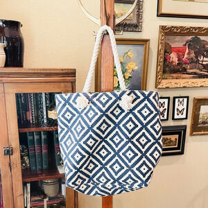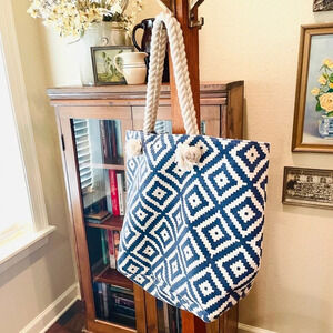 Summer & Rose rope handle beach tote bag, magnet closure , one interior pocket, blue white geometric diamond pattern