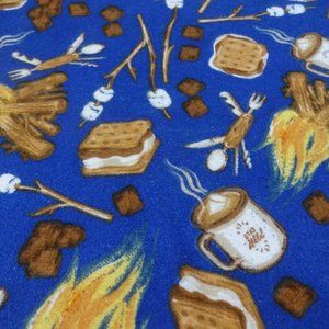 Fabric has SMORES & CAMPFIRES on a DEEP BLUE background.