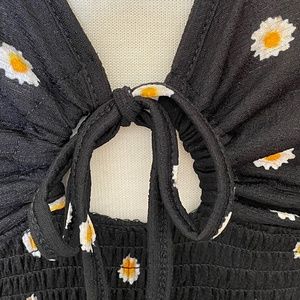 Summer Spring Mini Dress Black with Daisy Print Open Back Ties at neck Stretch