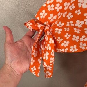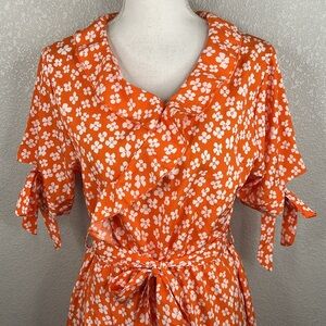 Summer Spring Orange & White Floral Romantic Ruffle Faux Wrap Dress Size Large