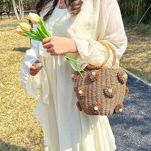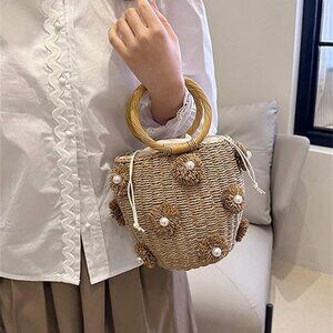 Summer Straw Bag Women Pearl Flower Bucket Tote Woven Rattan Purse