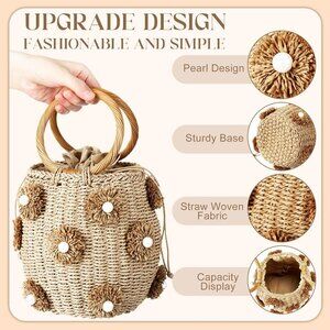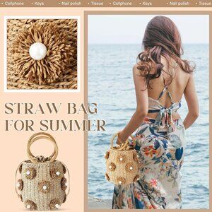 Summer Straw Tote Bag Women Beach Drawstring Rattan Handbag Pearl Flower