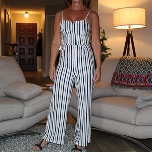 Blue and cream colored striped jumper with adjustable straps, size xs