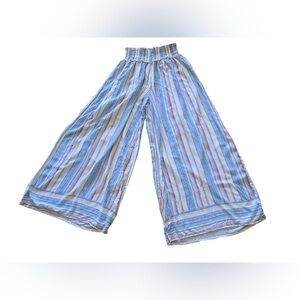 Questions? Leave a comment below! ocean dream palazzo wide leg" pants. These pants are characterized by their wide legs and a striped pattern featuring white, blue, and purple hues.
