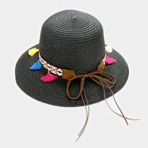 Summer Sun Hat w/ Short Brim and Tassels - Black