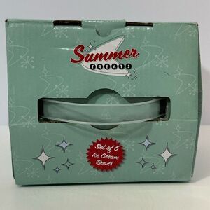 This set of 6 bowls can hold up to 10 oz of ice cream. It comes as a set with assorted colors of blue and green. Great for dessert time. Still in its original packaging. Never used. Still in excellent condition.