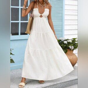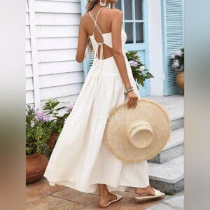 Summer Vacation Romantic Casual Deep V Lace-Up Backless Dress, Sleeveless White