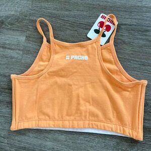 Trendy two-piece set featuring a vibrant orange crop tank top and a matching tie-dye mesh midi skirt. The top has a sporty look with spaghetti straps and “Since 1973” print detail on the front. The skirt is a sheer, body-skimming midi length with a bold pink and orange tie-dye pattern—perfect for layering over swimwear or styling as a festival outfit. Both pieces are brand new with tags. Made in Portugal and inspired by Ibiza style, this set gives off effortless summer and festival vibes.