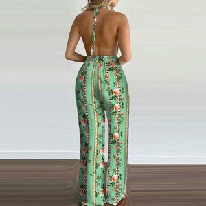 Summer Women Jumpsuits Outfits Tropical Print Halter V Neck Jumpsuit