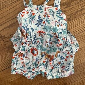 Set of three baby rompers size 3-6 months, featuring floral and strawberry designs.