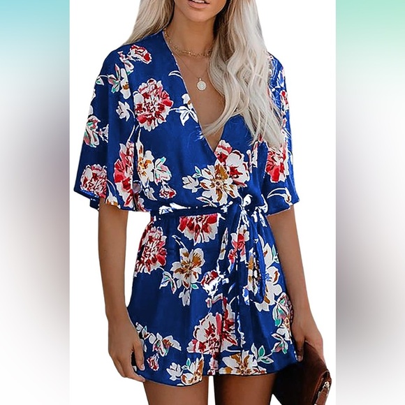 Blue and floral shorts romper. V-neck, waist tie, elastic waist jumpsuit button cheat closure