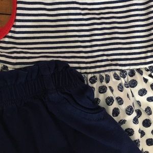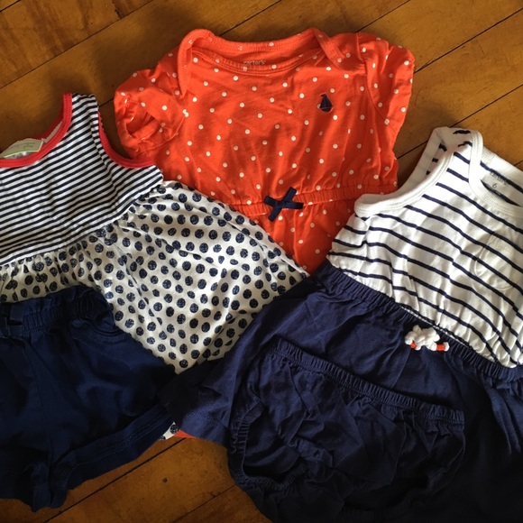 Three adorable summer outfits! Outfit with polka dots is 3-6 months and includes shorts. The blue and white outfit is 6 months and includes diaper cover. Coral/red dress is 6 months. Both in gently used condition. Outfits run similar in size.