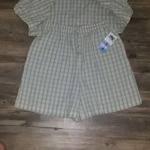 Button up top with back tie feature ends at hips. Shorts are thigh high, elastic waist, drawstring. 100% cool comfortable wicking cotton.