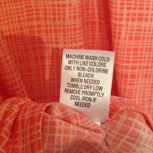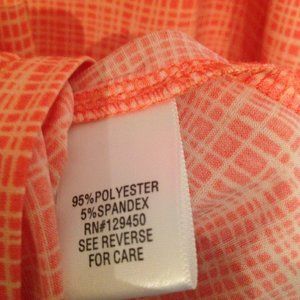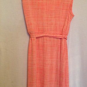 lightweight, no iron, sleeveless, waist tie, mid-thigh, flirty, great for summertime or vacation, vibrant orange and white pattern, flattering shape
