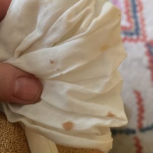 Never worn, in pretty good shape for being stuck in my closet. It has some spots on the bow. Not very noticeable. Says one size, but it runs on the smaller side.