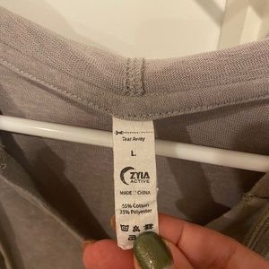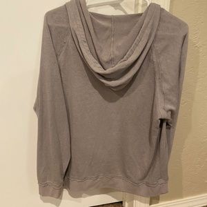 Light weight, thin summertime sweatshirt hoodie. Drawstring hood, kangaroo pocket in front, distressed details. Worn once. Grey/tan color. Hits at the hip. Loose design but not relaxed fit. Size large but can also fit medium