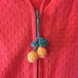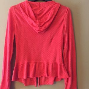 Paper thin cotton summer short hoodie by Moth for Anthropologie with darling knit ornament on zipper pull. Flattering ruffle at waist this is a perfect light summer cover up! Bright coral color. In great condition.