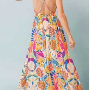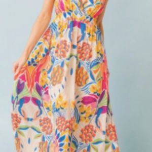 A printed woven maxi dress featuring surplice neckline with adjustable criss cross back tie and elasticized back waist from flying tomato. Strap needs to be sewn on - never worn
