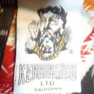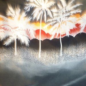Super cute palm tree-print shirt men's Kennington Hawaii button down shirt. Nice vibrant colors. Made in the Dominica Republic and is 100 percent polyester although it feels like rayon.