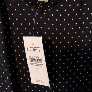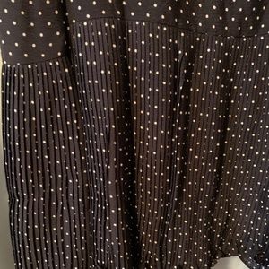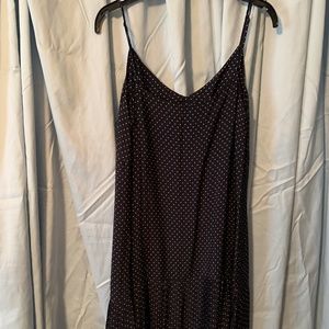 Navy and white polka dotted scrappy dress. Pleated style hem.